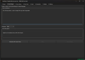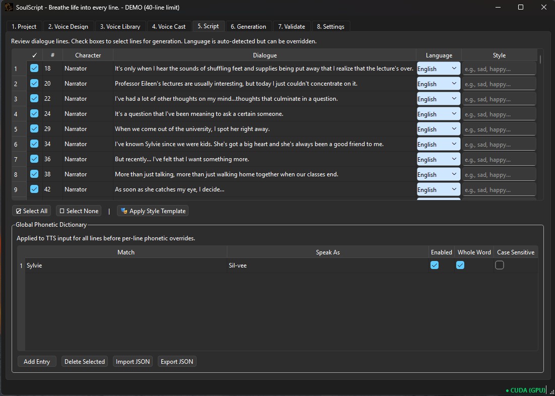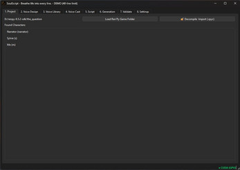 SoulScript includes a built-in Demo Mode so you can explore the full interface before purchasing. Generation is limited to the first 40 lines of a script, allowing you to test the workflow without unlocking the full output.