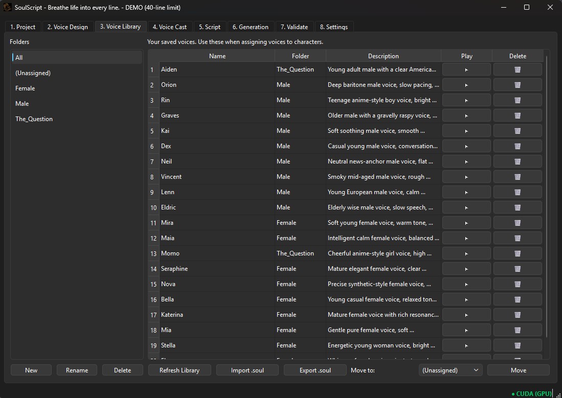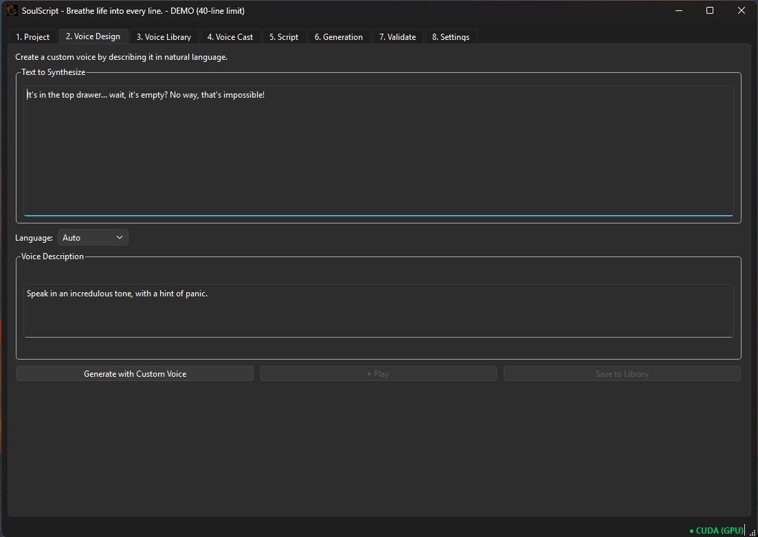 SoulScript provides: Voice design using natural language descriptions Per-line performance instructions Waveform preview and validation tools Batch generation with GPU acceleration (CPU supported) These tools are designed to feel like part of the creative process rather than a technical hurdle.