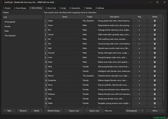 SoulScript is a desktop application built for visual novel creators who want a fast, organized way to generate character voice audio using modern AI text-to-speech models. Instead of juggling multiple tools, scripts, and manual audio workflows, SoulScript brings voice creation, editing, validation, and export into a single offline pipeline designed specifically for Ren’Py projects. Everything runs locally on your computer — your scripts, voices, and generated audio stay private.