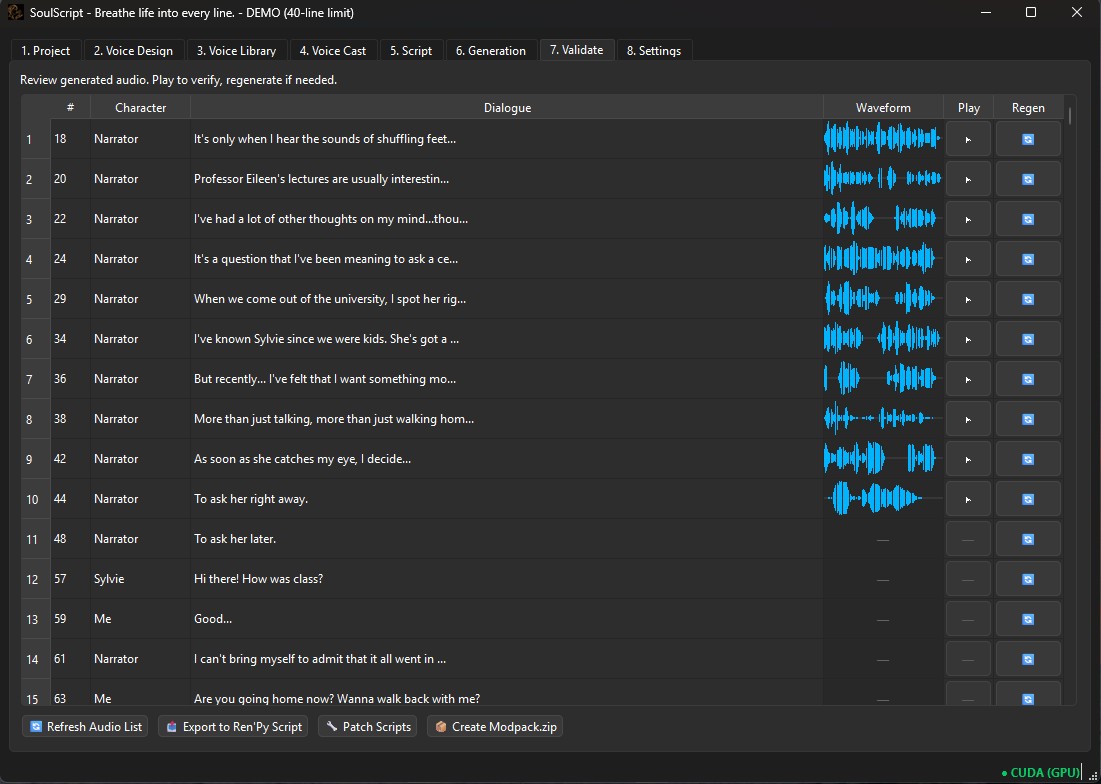 Whether you’re: building a full visual novel adding voices to an existing project creating a voice mod SoulScript helps you move from script to playable audio faster.